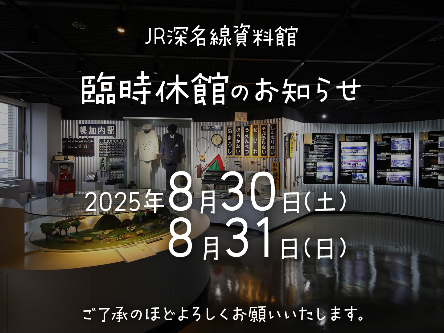 2025年8月8日 / Last updated : 2025年8月8日 幌加内町観光協会 JR深名線資料館 臨時休館のお知らせ(8/30-31) 2025年8月30日(土)・31日(日)は、幌加内町新そば祭り開催のため、JR深名線資料館は臨時休館となります。ご了承のほどよろしくお願いいたします。 FacebookXBluesky