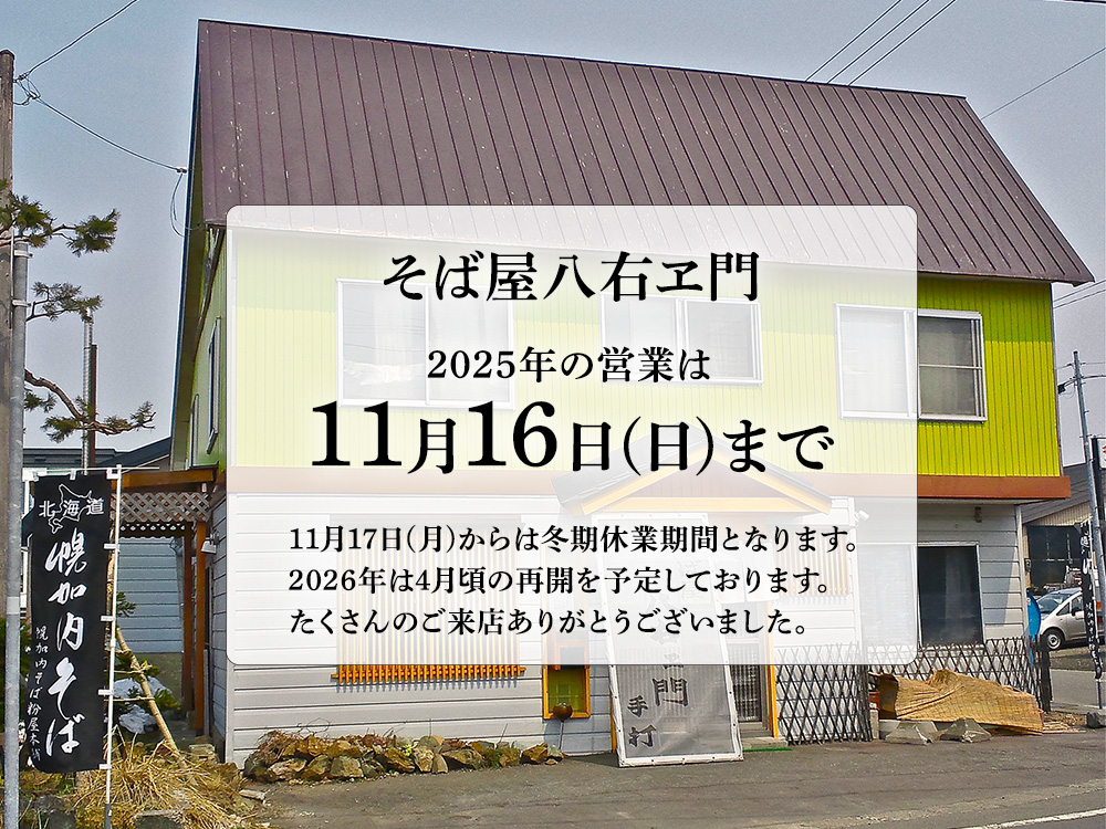 「そば屋八右ヱ門」は11月16日(日)が今年の最終営業日となります。