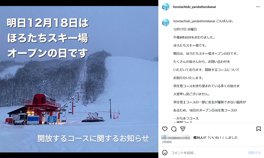 ほろたちスキー場は12/18(木) 9:00オープンとのアナウンスがありました。