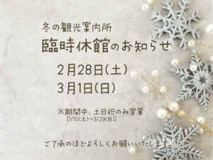 2026年2月22日 / Last updated : 2026年2月22日 幌加内町観光協会 冬の観光案内所 臨時休館のお知らせ(2/23) 幌加内町交流プラザにて開催中の「冬の観光案内所」は、2026年2月23日(月祝) 臨時休館となります。何卒ご了承のほどよろしくお願いいたします。 深名線資料館についても、同様に閉館となりますのでご理解のほどよろしくお願いいたします。 FacebookXBluesky